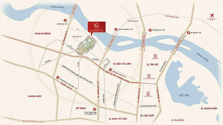 – Đại lộ Tây Thăng Long: Tuyến đường huyết mạch rộng 60m với 10 làn xe, kết nối trực tiếp từ dự án qua các quận Bắc Từ Liêm, Tây Hồ và vào thẳng trung tâm. Điều này giúp rút ngắn khoảng cách từ dự án đến Hồ Tây chỉ còn khoảng 15 phút di chuyển.
